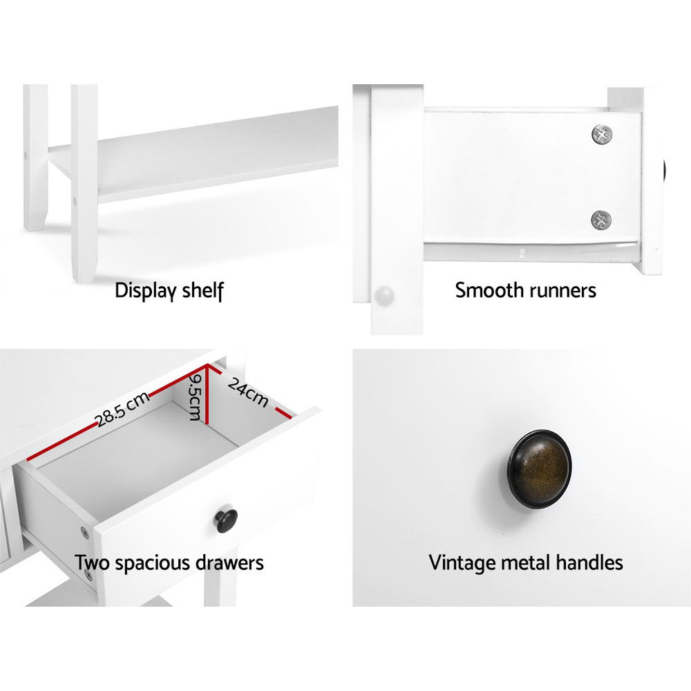 Every home that considers itself a stylish and contemporary example should have our beautiful Console Table lining its doorway or hallway. It can also serve as a wonderful front console table for your café, restaurant or shop to welcome customers with chic and charm. Crafted from high-quality E1 MDF board with smooth NC lacquer finish, the console table features a timeless design that is well proportioned and durable in every aspect. Two generous-sized drawers with vintage-style metal handles provide ample storage space for your essentials and knick-knacks while the wide tabletop and large bottom shelf let you display your favourite home décor in resplendent style. Make a grand entrance for your guests or even for yourself with our console table. It will be a gracious welcome indeed.
