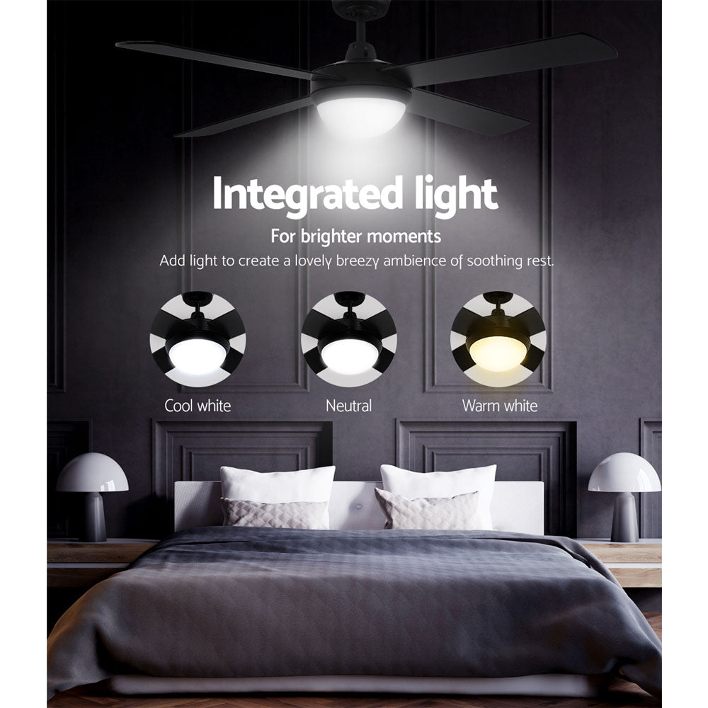 Gentle breezes, light drafts or high winds, the Devanti 52-inch Ceiling Fan is ever ready to meet your requirements easily. With three fan speeds, the contemporary-design ceiling fan also has a reverse cycle motor that can create downdrafts during summer or updrafts during winter for greater comfort. Its four high-quality wooden blades are pitched at an airflow-inducing 12 degree for more effective wind creation. Plus, its energy-efficient 70W motor operates ever so quietly. Also featured is built-in LED lighting that can bring on a cool white, warm white or neutral lighting ambience to go with the fanning function. Better still, the fan can be set for up to 8 hours of timed operation and the handy remote control makes this fan a breeze to use from anywhere in the room. The ceiling fan also comes with all the accessories for an easy installation including an extension rod. Available in black, white or silver colour to match your decoration easily.