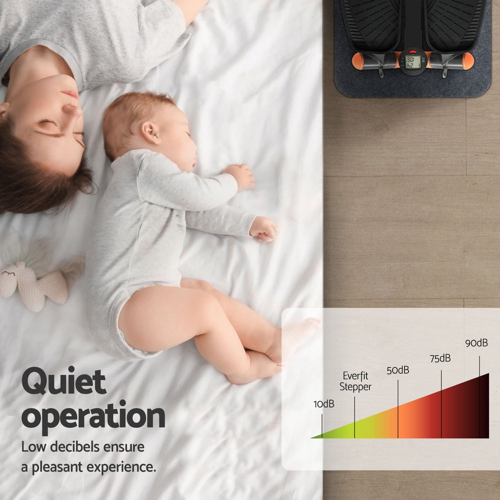 Step up your fitness game with a Mini Stepper from Everfit. Target your thighs, calves, waist and hips without leaving your home. The Mini Stepper is portable thanks to its miniature size, making it perfect for use under your desk, in the living room, or on the go. The stepper has an anti-slip pedal surface and edge for safety and stability, and your package includes a non-slip rubber mat to keep everything in its place. The stepper has a high weight capacity of 150kg and the upgraded mute ring design operates quietly for a pleasant exercise session that won’t disturb your guests or family. The LCD screen will show you all your fitness data as you exercise, and the detachable soft pedal pad is easy on your feet and easy to maintain. It requires no assembly and folds neatly away when not in use. Best of all, the stepper comes with two bonus resistance ropes so you can perform a variety of exercises. Get fit today from the comfort of your home or office with the versatile Everfit Mini Stepper.